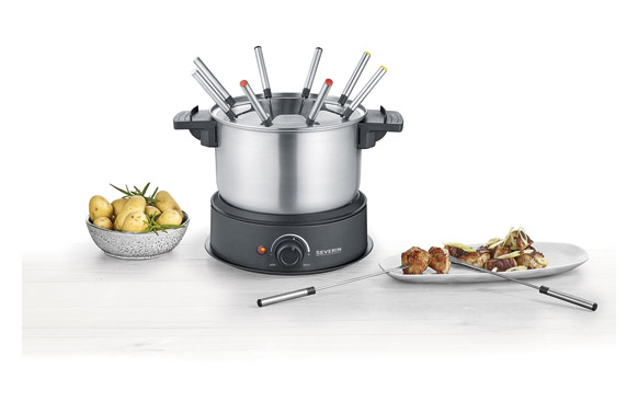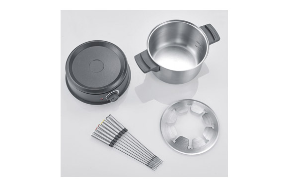 Fondue con recipiente de acero inoxidable, desmontable y apto para el lavavajillas. . Los tenedores y la protección contra salpicaduras también son aptas para lavavajillas. . Cable de 100 cm. Potencia 1500 W. Capacidad 1.400 ml. .