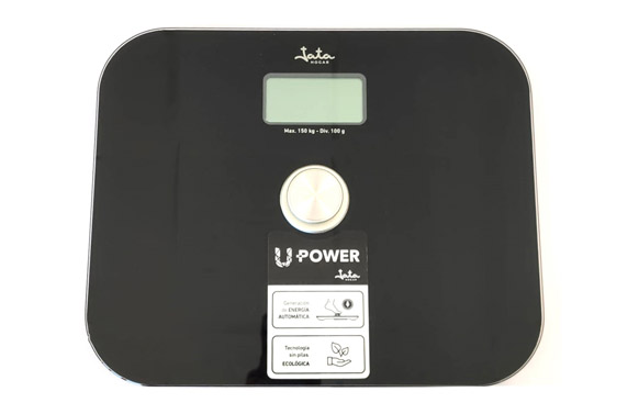 BÁSCULA SIN PILAS .U-POWER NEGRA. Tecnología sin pilas.. U-Power: generación de energía automática.. Capacidad 150 kg.. Graduación 100 g.. Base de cristal de seguridad .temperit. de 5 mm de espesor.. 4 sensores. . Alta precisión.. Visor .LCD. dígitos de gran visión. 4 dígitos.. Desconexión automática.. Interruptor para conversión kg / lb.. Indicador de sobrepeso. .
